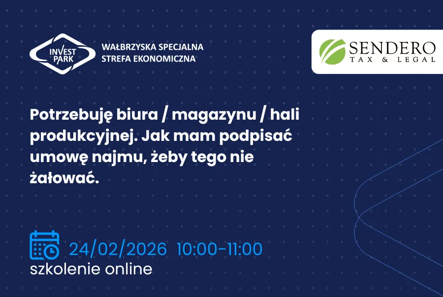 Wałbrzyska Specjalna Strefa Ekonomiczna „INVEST-PARK” wspólnie z Kancelarią Sendero Tax & Legal zaprasza na drugie webinarium „Potrzebuję biura / magazynu / hali produkcyjnej. Jak mam podpisać umowę najmu, żeby tego nie żałować.”, które odbędzie się 24 ...