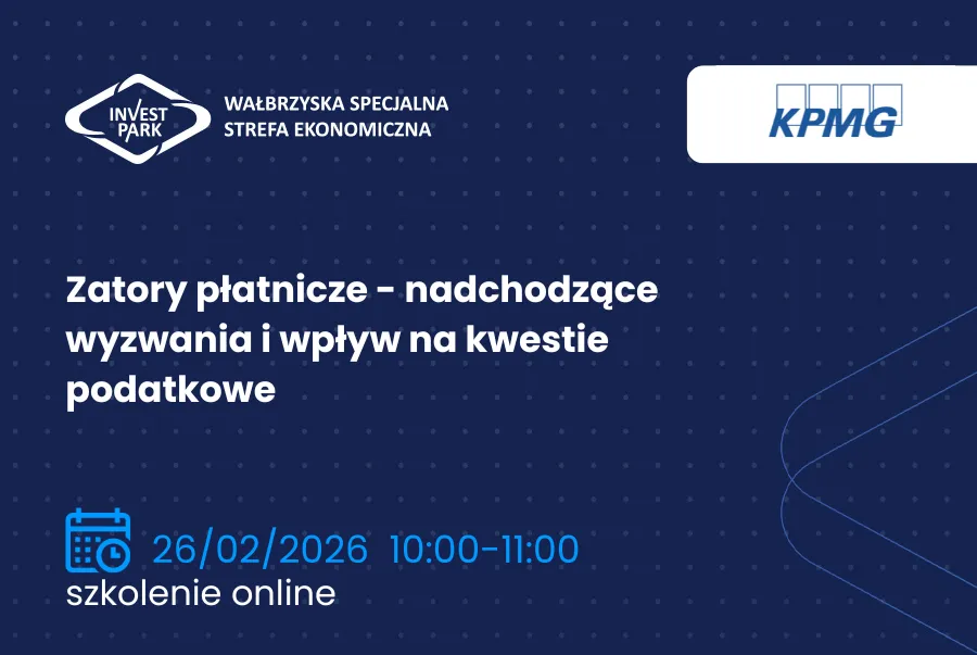 Wałbrzyska Specjalna Strefa Ekonomiczna „INVEST-PARK” wspólnie z KPMG zaprasza na webinarium: „Zatory płatnicze – nadchodzące wyzwania i wpływ na kwestie podatkowe”, które odbędzie się 26 lutego 2026 r. w godzinach 10:00 – 11:00