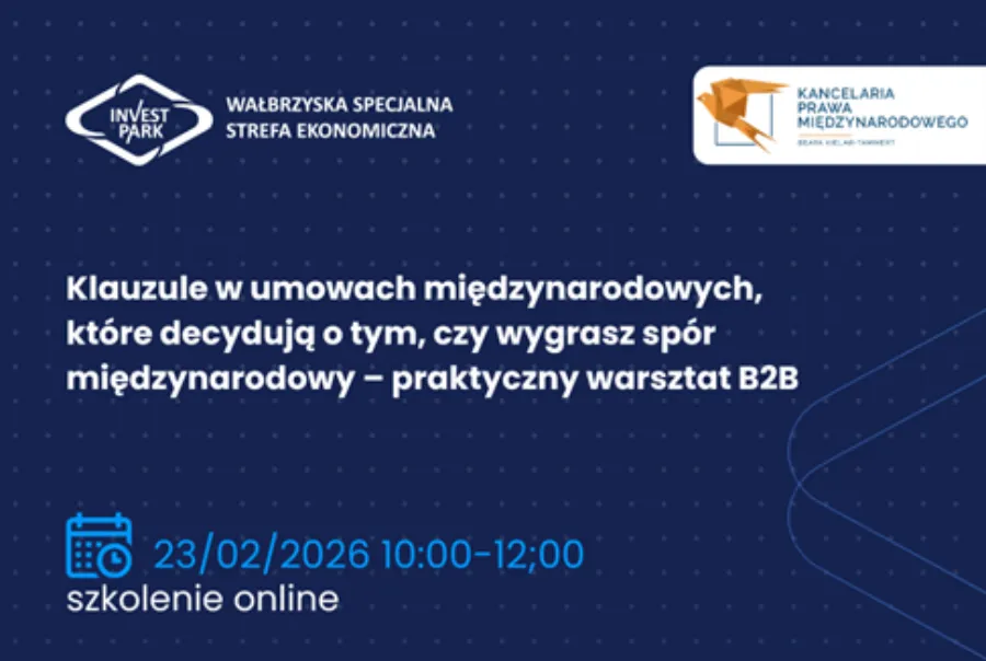 Wałbrzyska Specjalna Strefa Ekonomiczna „INVEST-PARK” wspólnie z Kancelarią Prawa Międzynarodowego BKT zaprasza na webinarium „Klauzule w umowach międzynarodowych, które decydują o tym, czy wygrasz spór międzynarodowy – praktyczny warsztat B2B”,  które odbędzie się 23 lutego 2026 r. w godzinach ...