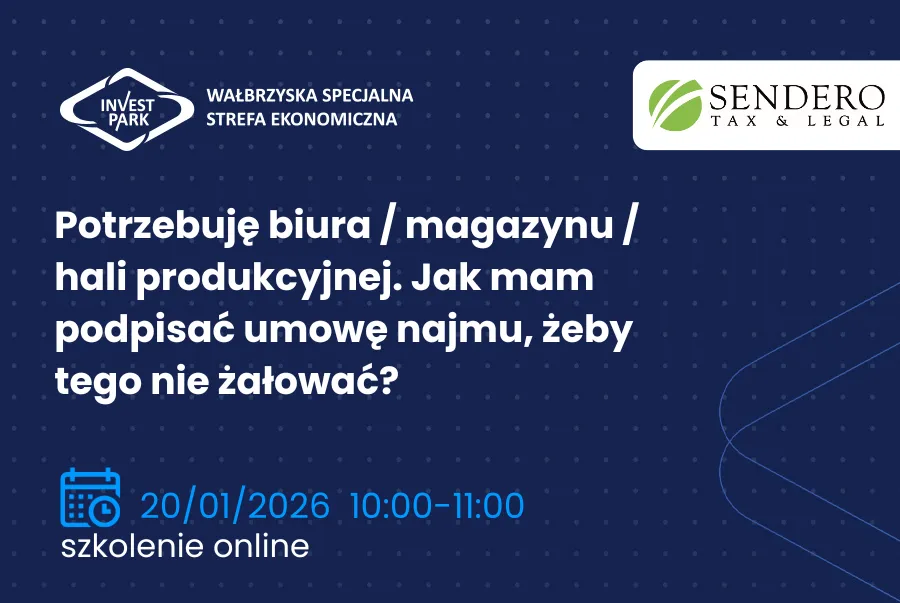 Wałbrzyska Specjalna Strefa Ekonomiczna „INVEST-PARK” wspólnie z Kancelarią Sendero Tax & Legal zaprasza na webinarium „Potrzebuję biura / magazynu / hali produkcyjnej. Jak mam podpisać umowę najmu, żeby tego nie żałować.”, które odbędzie się 20 stycznia 2026 r. w godzinach ...
