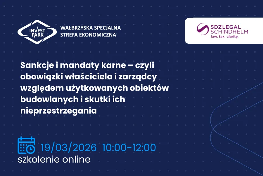 Wałbrzyska Specjalna Strefa Ekonomiczna „INVEST-PARK” wspólnie z Kancelarią SDZLEGAL Schindhelm zaprasza na webinarium „Sankcje i mandaty karne – czyli obowiązki właściciela i zarządcy względem użytkowanych obiektów budowlanych i skutki ich nieprzestrzegania”, które odbędzie się 19 marca 2026 r. ...