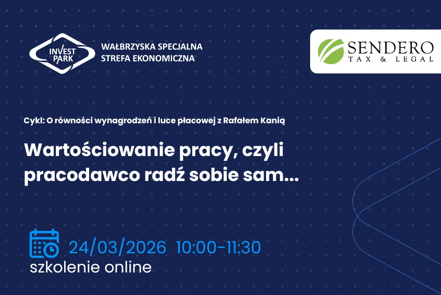 Wałbrzyska Specjalna Strefa Ekonomiczna „INVEST-PARK” wspólnie z Kancelarią Sendero Tax & Legal zaprasza na drugie webinarium z cyklu  „O równości wynagrodzeń i luce płacowej z Rafałem Kanią” pt. Wartościowanie pracy, czyli pracodawco radź sobie sam…”, które odbędzie się 24 marca ...